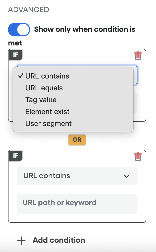 4. You can set conditions for checklist items display. This means each item can be shown or hidden based on user context (for example, plan type, tags, or UI elements). In addition, you can define multiple conditions, so an item will be displayed if any of the conditions are met.