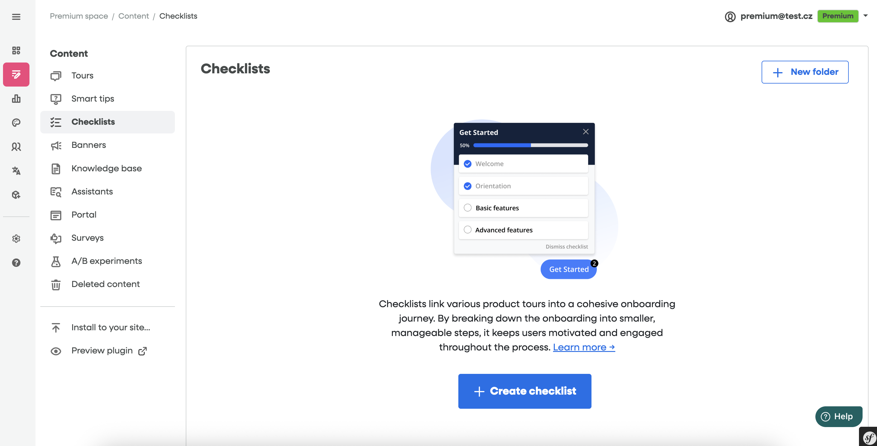 A Checklist is a collection of product tours that motivates users to complete items. Apart from being a collection of tours, it can also contain link items (to redirect users to additional contextually helpful content).