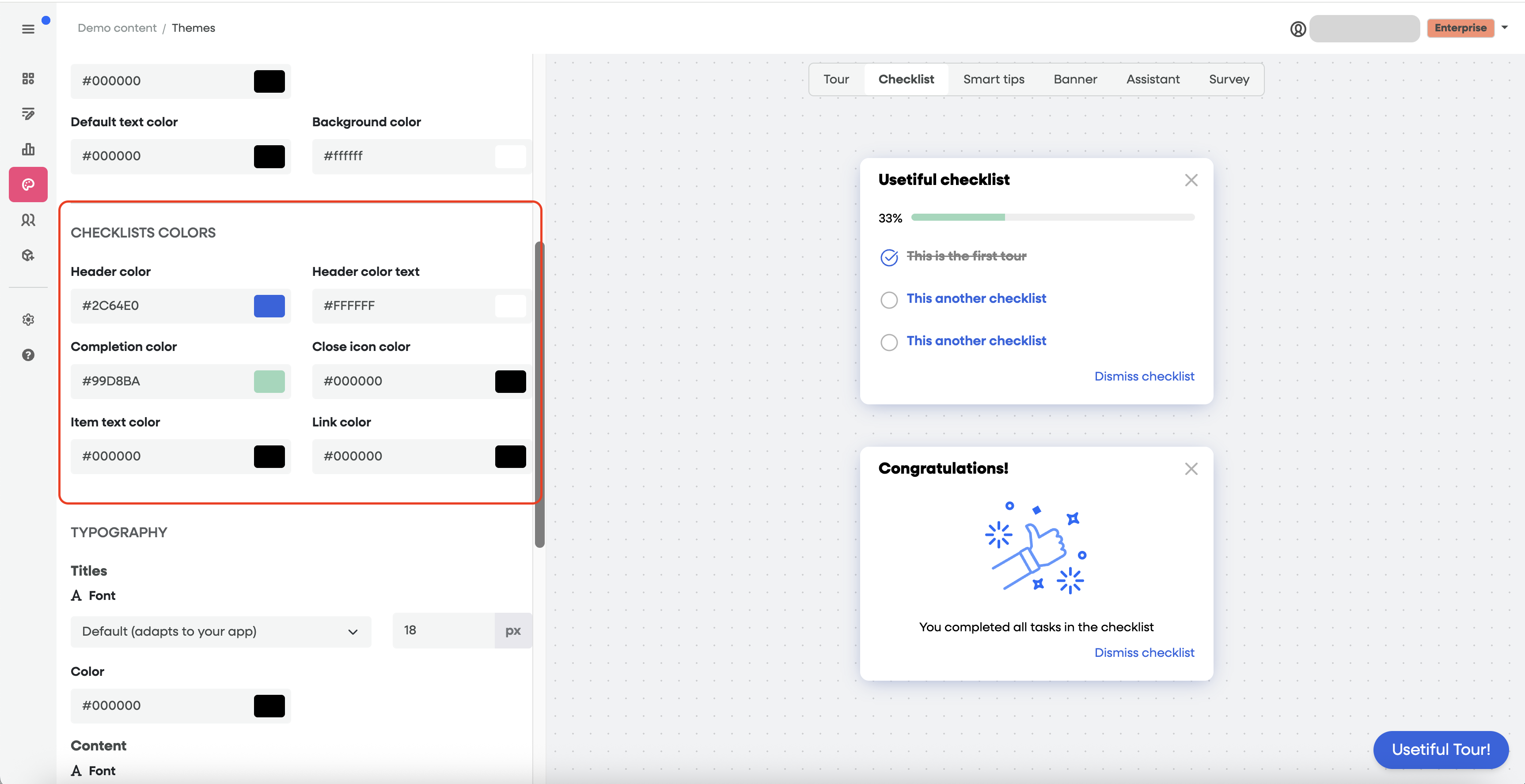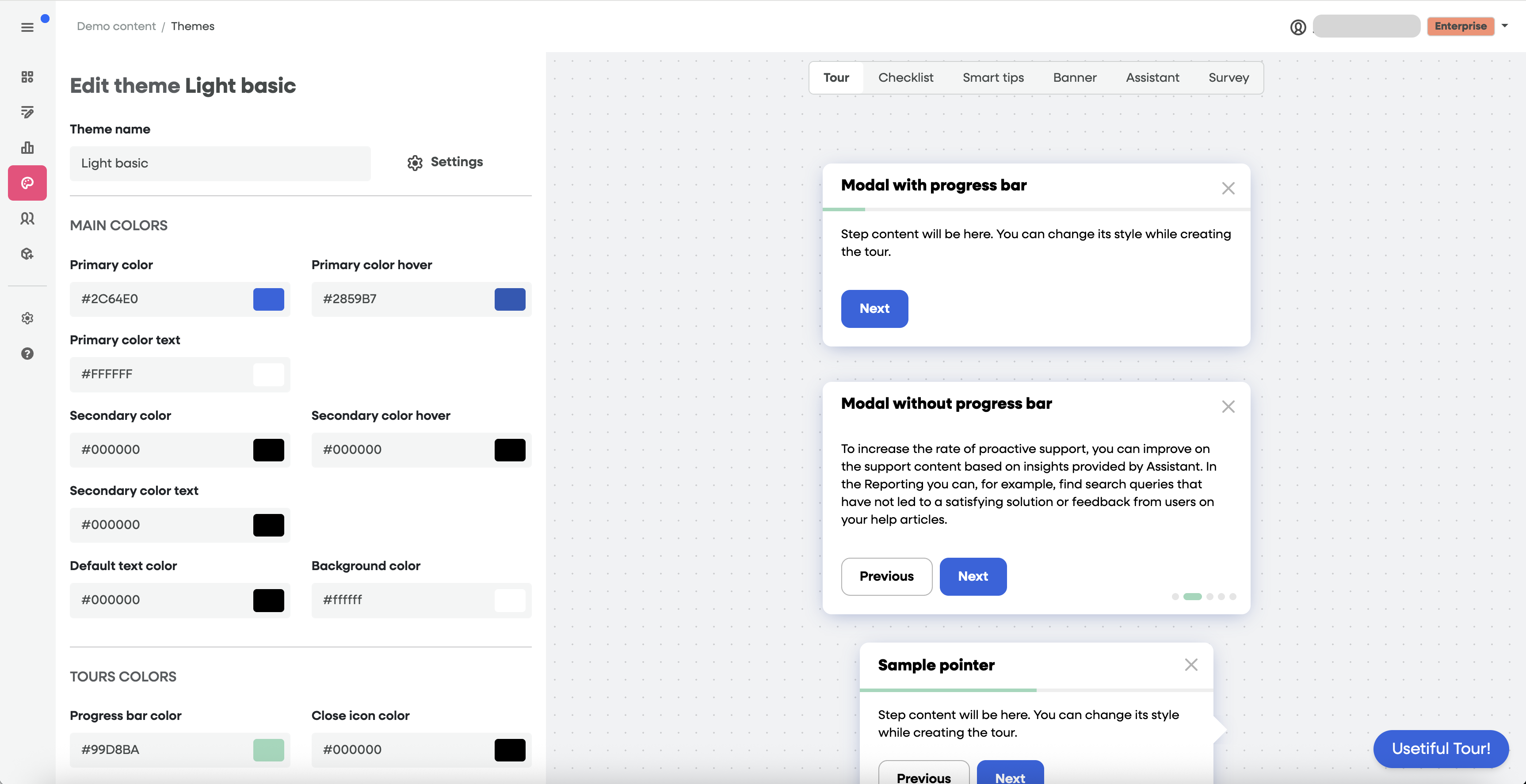You can set a default theme across your entire Usetiful content. Setting a default ensures that all new content—such as tours, smart tips, checklists, or assistants—automatically adopts this theme.