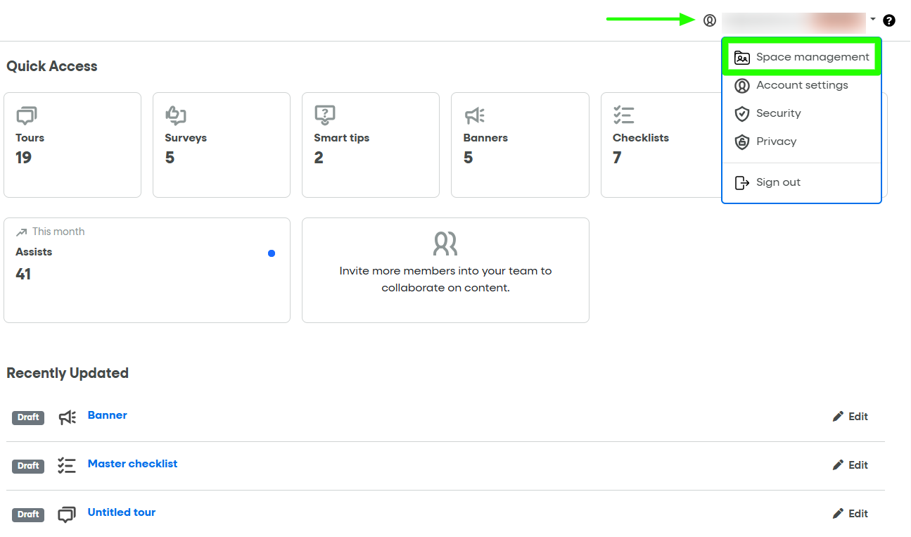 Click on the Space Management (located in the dropdown menu of the sidebar or in your profile menu).
