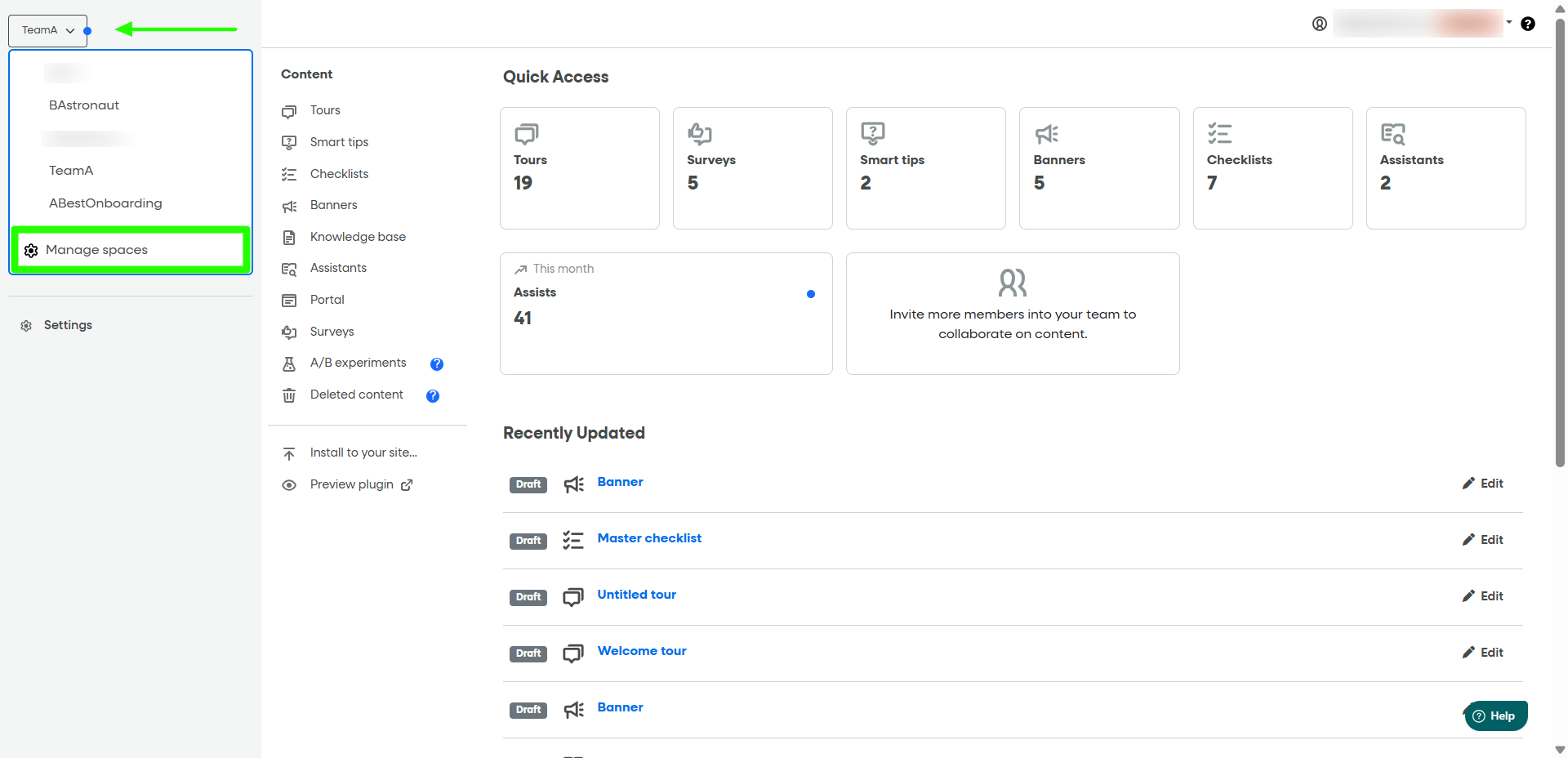 Switching Spaces: The Manage spaces selector will appear in your dashboard as soon as you have more than one Space created.