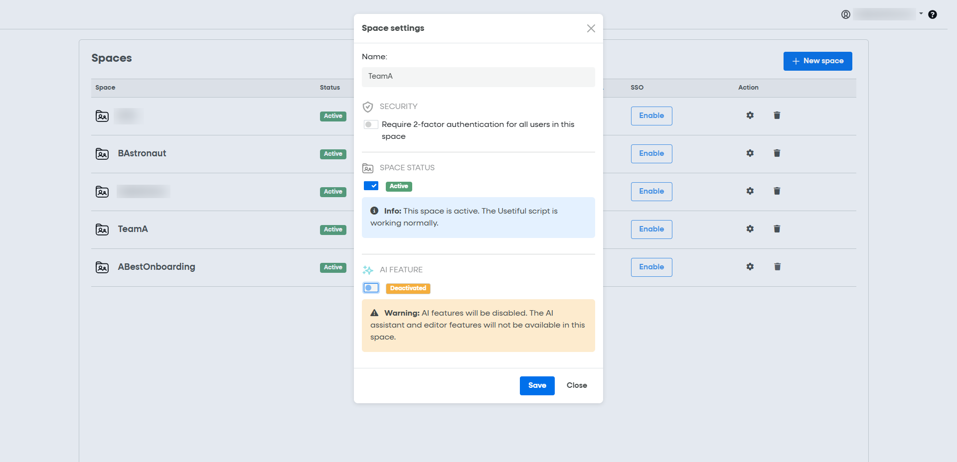 Deactivating a Space: If you need to take a project offline, you can deactivate the Space. Once deactivated, the Usetiful script will stop working immediately, and all content will become unavailable to your end users.