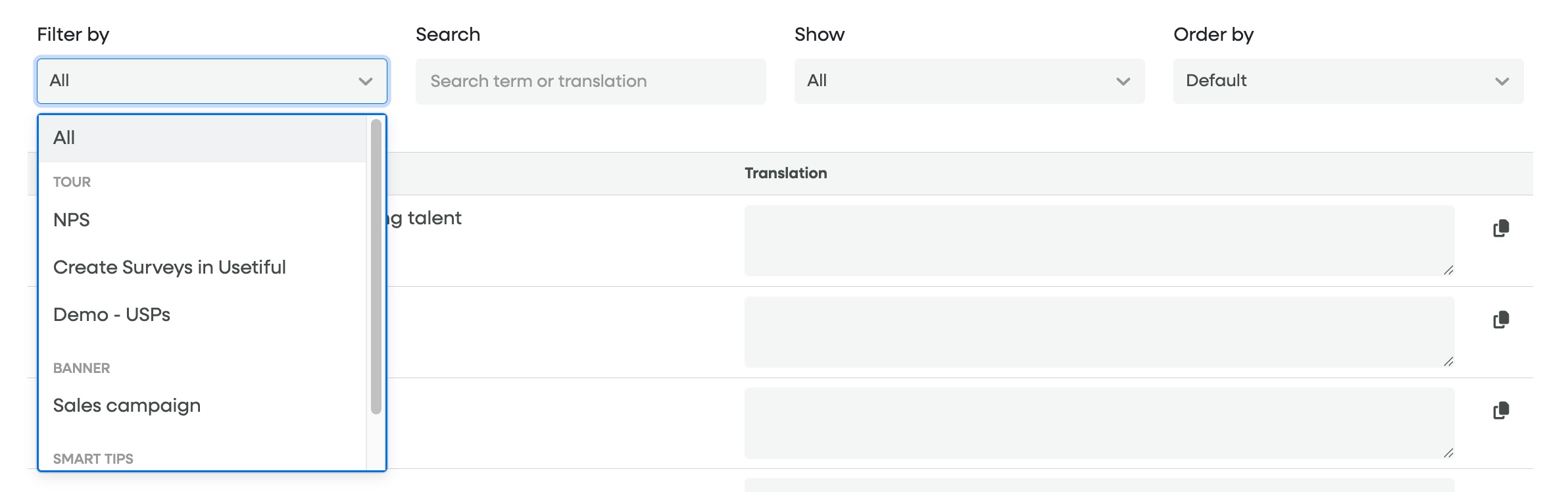 The Localization module empowers you to translate content both within and outside of Usetiful. It comprises an intuitive administration interface for efficient translation management and an API that provides access to translated terms from the system.