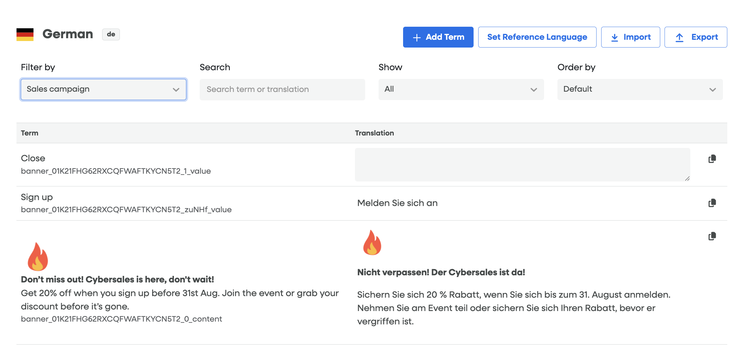 Exportfunction to download all your Terms in CSV, JSON, or XLIFF format.Have your translators work on the file.