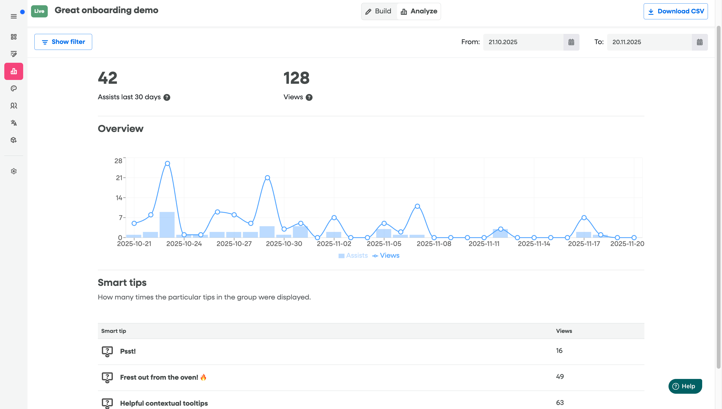 Track Adoption Over Time: Use the Overview Chart to see if the visibility of your tips (Views) is growing as your user base increases or as you promote a new feature.
