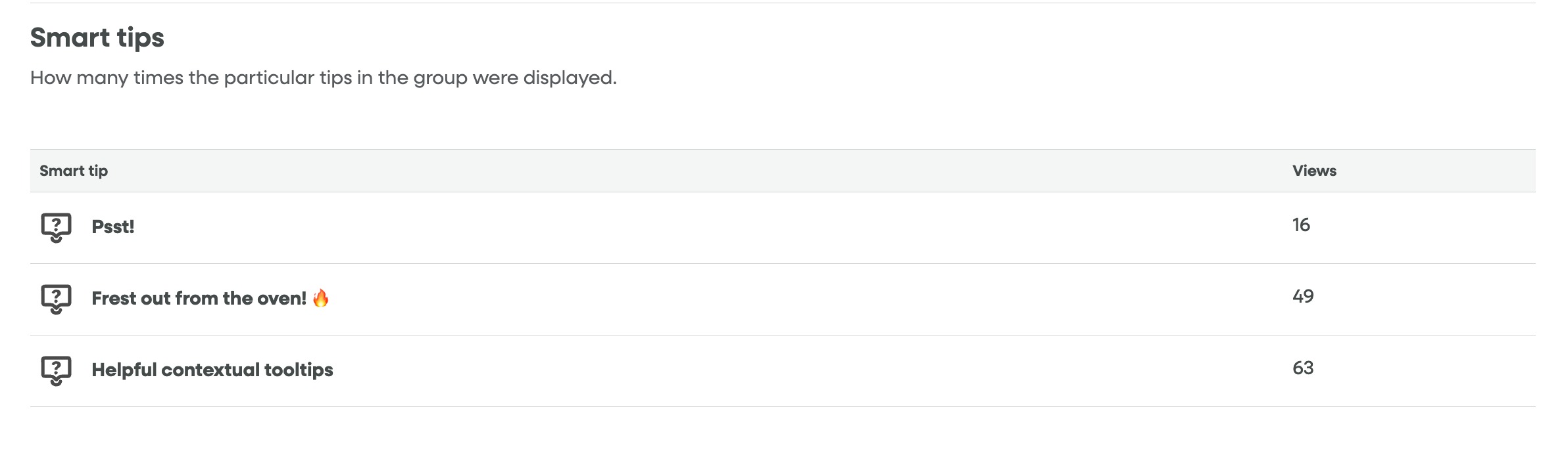 | Views | The total number of times a Smart Tip was displayed (rendered on the screen) to a user. | Measures the visibility and reach of your tips. |