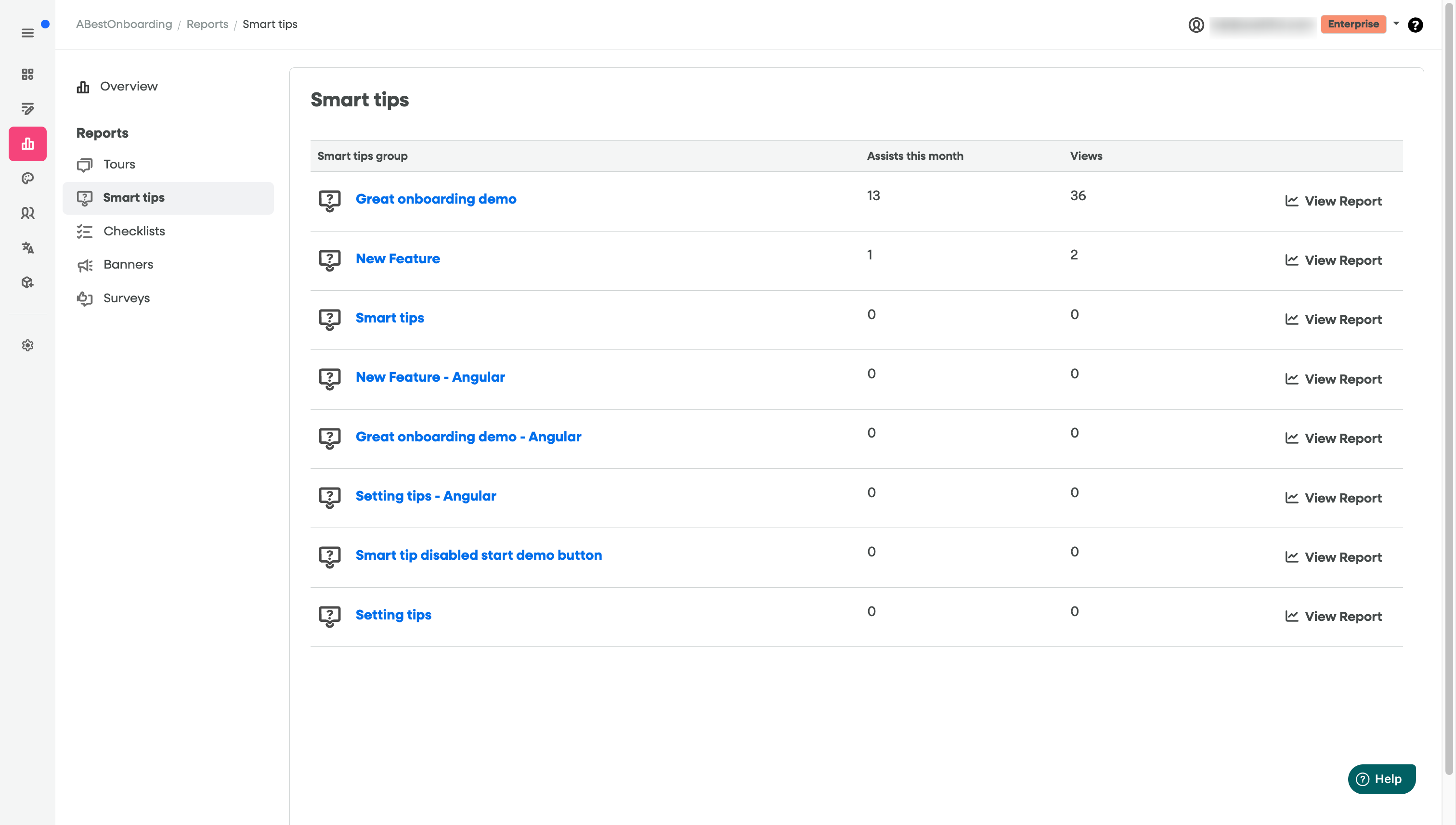 The Smart Tips Report provides a detailed analysis of the performance and visibility of your Smart Tips—short, contextual guides designed to assist users within a specific application group. Understanding these metrics helps you gauge user engagement and the effectiveness of your proactive assistance.